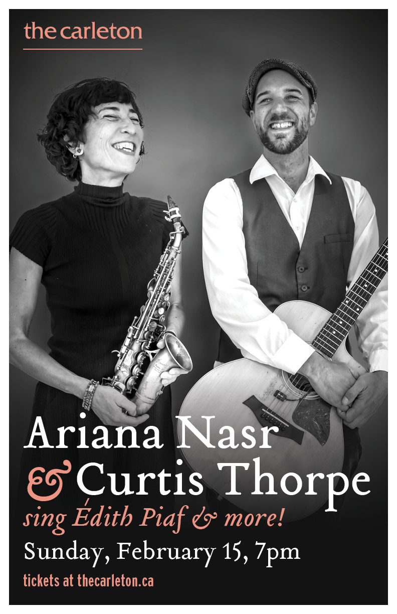 Carleton audiences may remember Ariana Nasr & Curtis Thorpe, from their popular Édith Piaf-themed Valentine’s Day performances. On Sunday, February 15th, the duo returns to The Carleton with their signature show: an eclectic mix of French chanson, jazz, and world music, featuring Ariana’s riveting vocals and soprano saxophone and Curtis’ one-man-band of guitar, harmonicas, and percussion. Expect to hear favourites from Édith Piaf, Jacques Brel, Dave Brubeck, Nina Simone, as well as classics from around the world.Show time is 7 PM and tickets are $30+ HST.