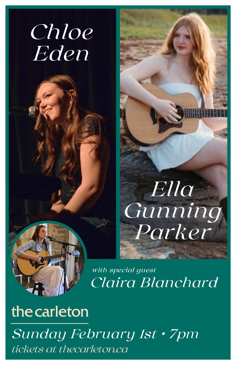 Young songwriters Chloe Eden & Ella Gunning Parker, along with special guest Claira Blanchard, combine talents for a show at The Carleton on Sunday, February 1st. Live music gets underway at 7 PM and tickets are $20 + HST.