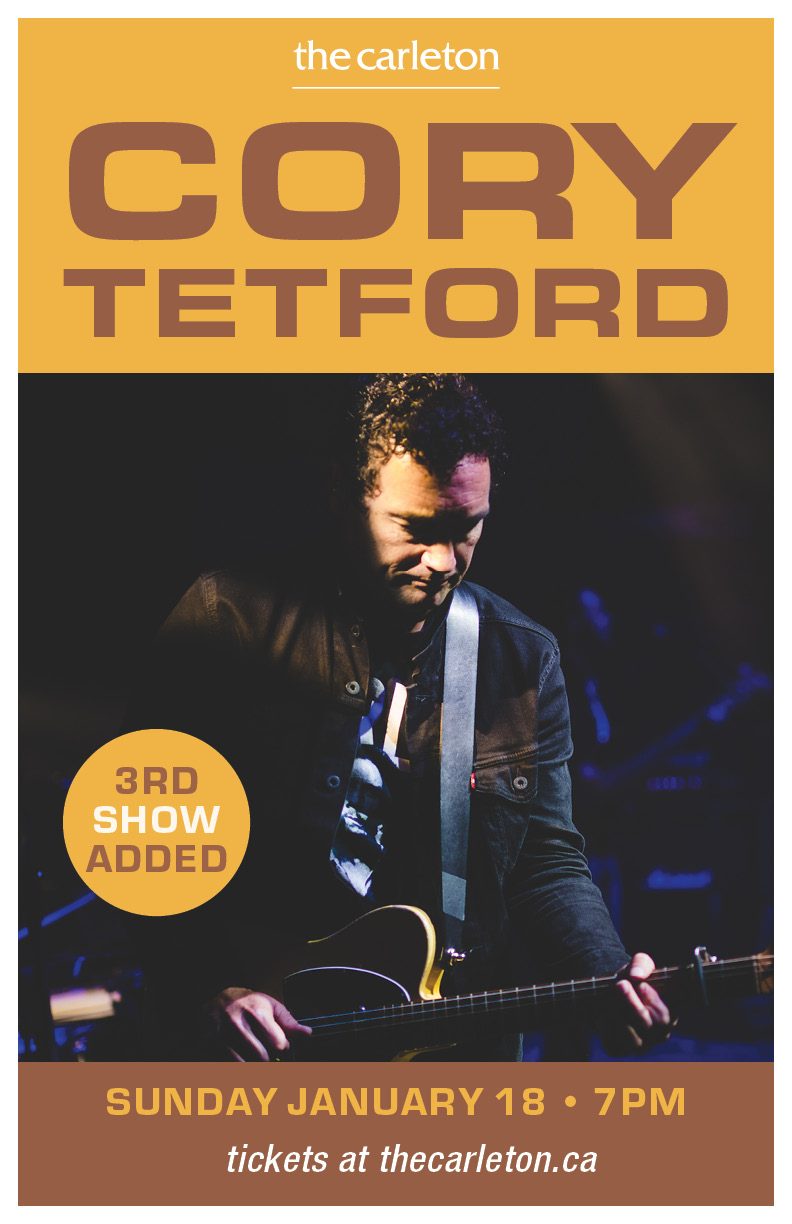 Quadruple threat (singing, songwriting, guitar and piano playing) Cory Tetford – during a break from touring with Alan Doyle – returns to The Carleton as a trio (with Ron Hynes on bass & Kris MacFarlane on drums) for a third show on Sunday, January 18th. Show time is 7 PM and tickets are $50+ HST.