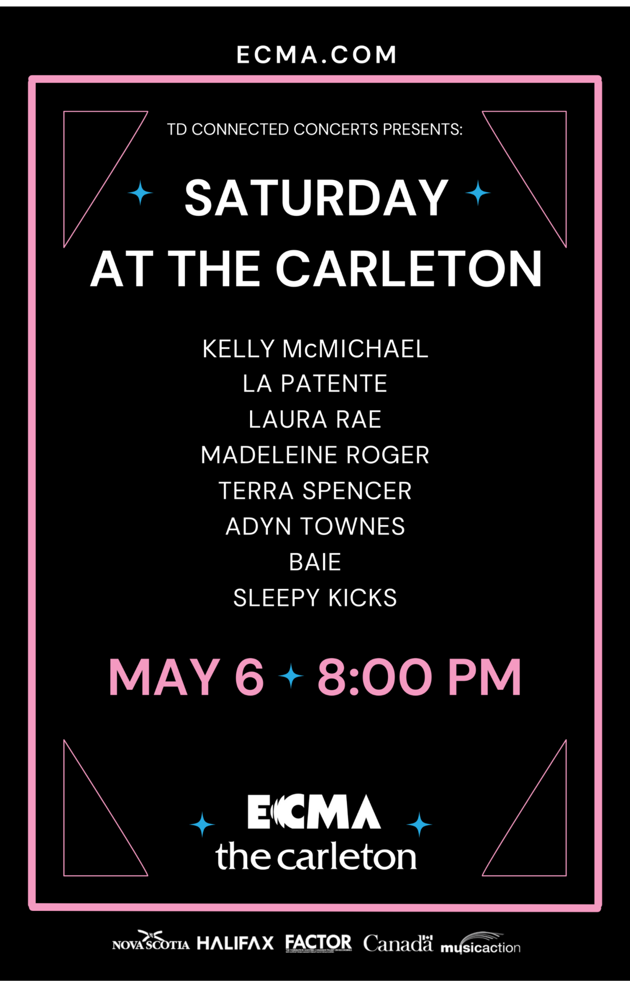The East Coast Music Awards are back in town and will be presenting showcases by Blue Lobelia, La Patente, Laura Rae, Madeleine Roger, Terra Spencer, Adyn Townes, Baie, and Sleepy Kicks at The Carleton on Saturday, May 6th at 8 PM. In order to get wristbands and/or passes, please find them on the ECMA site HERE!