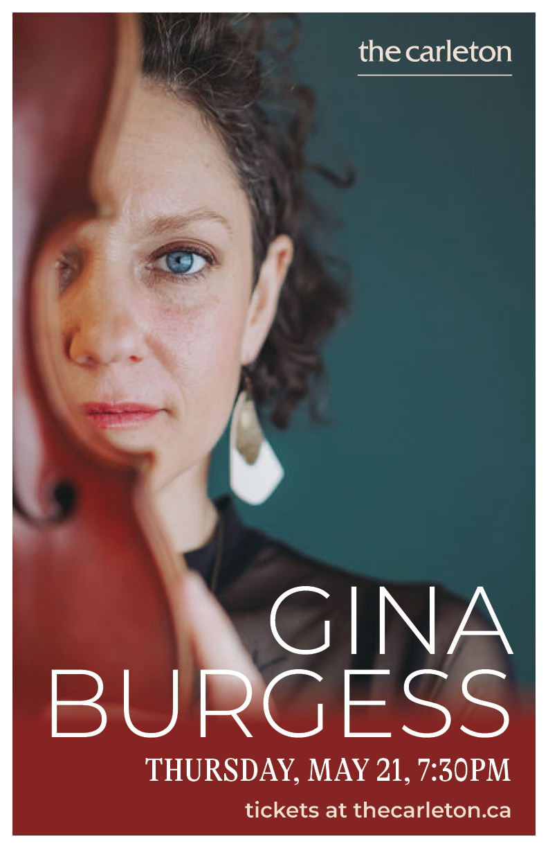 Violinist, composer, yoga instructor, educator, and musician wellness facilitator Gina Burgess returns to The Carleton to début her own full band (Gina on violin, Cynthia Pitsiulak – contemporary Inuit throat singer, Greg Woolner – drums, Jordan Stephans – double bass and Ross Burns – Brazilian percussion) show on Thursday, May 21st. Show time is 7:30 PM and tickets are $25 + HST.