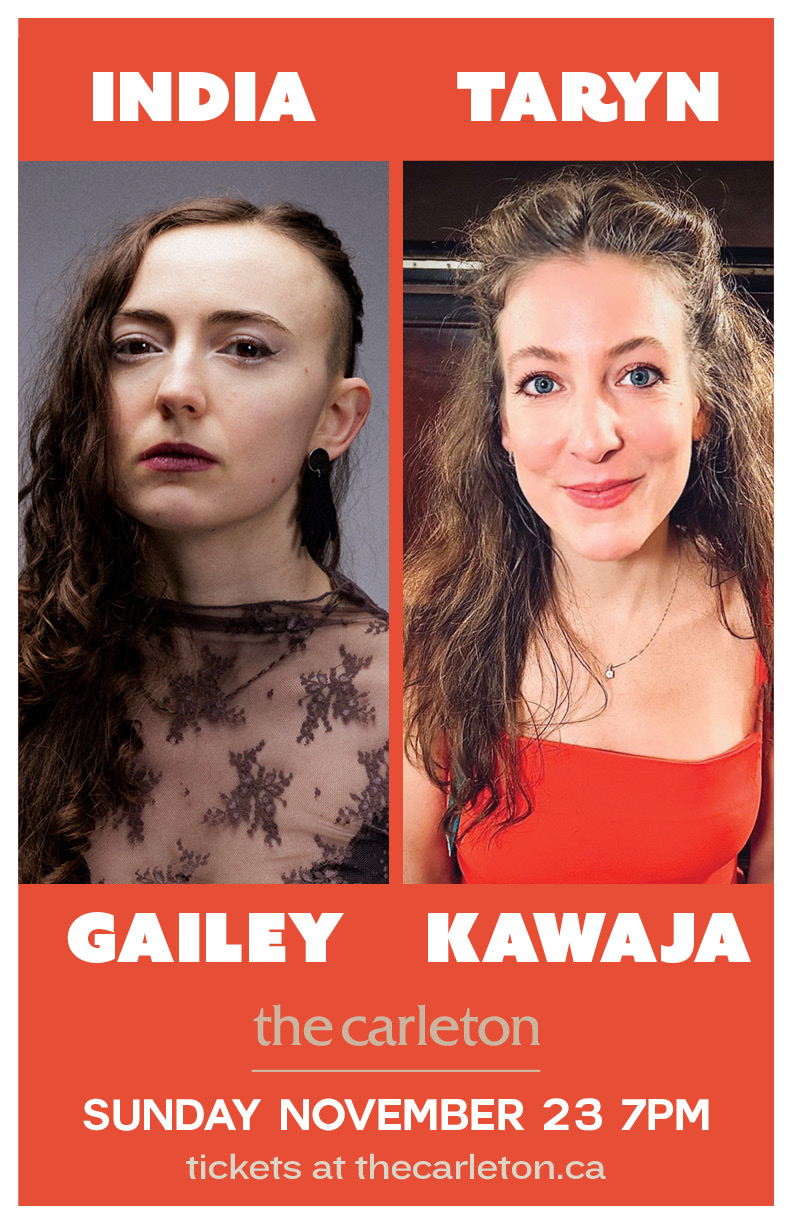 Cellist India Gailey teams up with songwriter Taryn Kawaja for a very special performance at The Carleton on Sunday, November 23rd. Show time is 7 PM and tickets are $25 + HST.