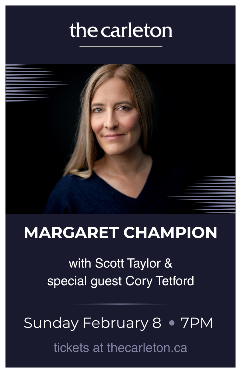 On the heels of the release of a new single, Some Days, Margaret Champion, with Scott Taylor and special guest Cory Tetford, makes her début at The Carleton on Sunday, February 8th, Show time is a civilized 7 PM and tickets are $25 + HST.