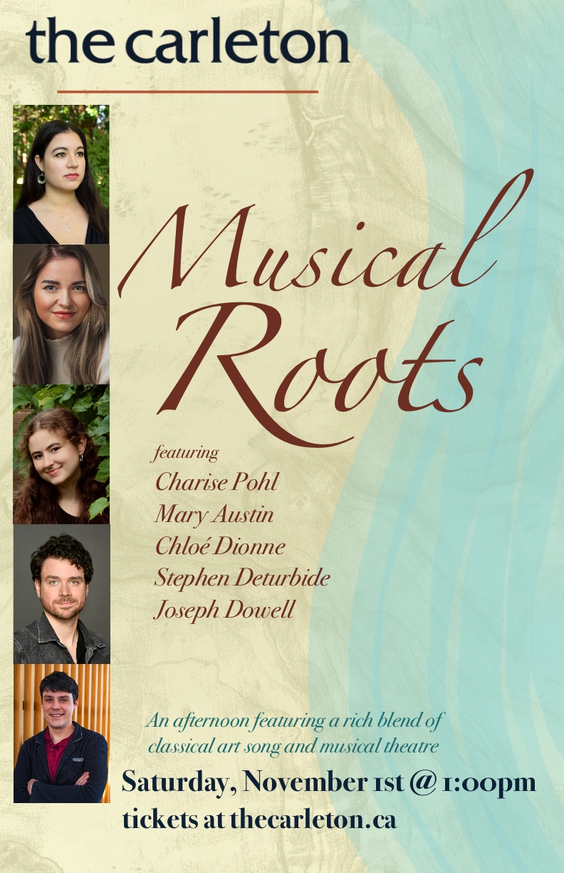 Postponed from August and worth the wait… Musical Roots: An Afternoon of Song From Classical Elegance to Theatrical Flair! Join celebrated local sopranos Charise Pohl, Chloé Dionne, and Mary Austin, alongside baritone Stephen Deturbide and pianist Joseph Dowell, for a captivating musical journey at The Carleton on the afternoon of Saturday, November 1st. Doors open at noon for brunch and beverages and the performance starts at 1 PM. Tickets are $28 + HST.