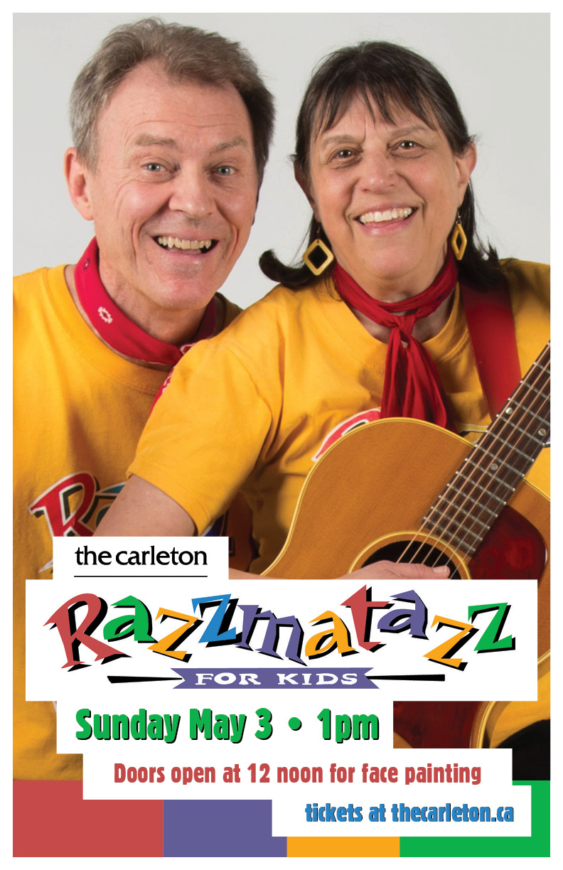 Usually we do serious shows for adult audiences but here’s one for the kids (and their parents): ECMA and Music Nova Scotia award winning duo, Razzmatazz For Kids, will again roll into The Carleton on Sunday, May 3rd. Doors open for face-painting (and brunch from The Carleton menu) at noon. Music gets underway at 1 PM. Tickets (for both kids and adults) are $20 + HST.
