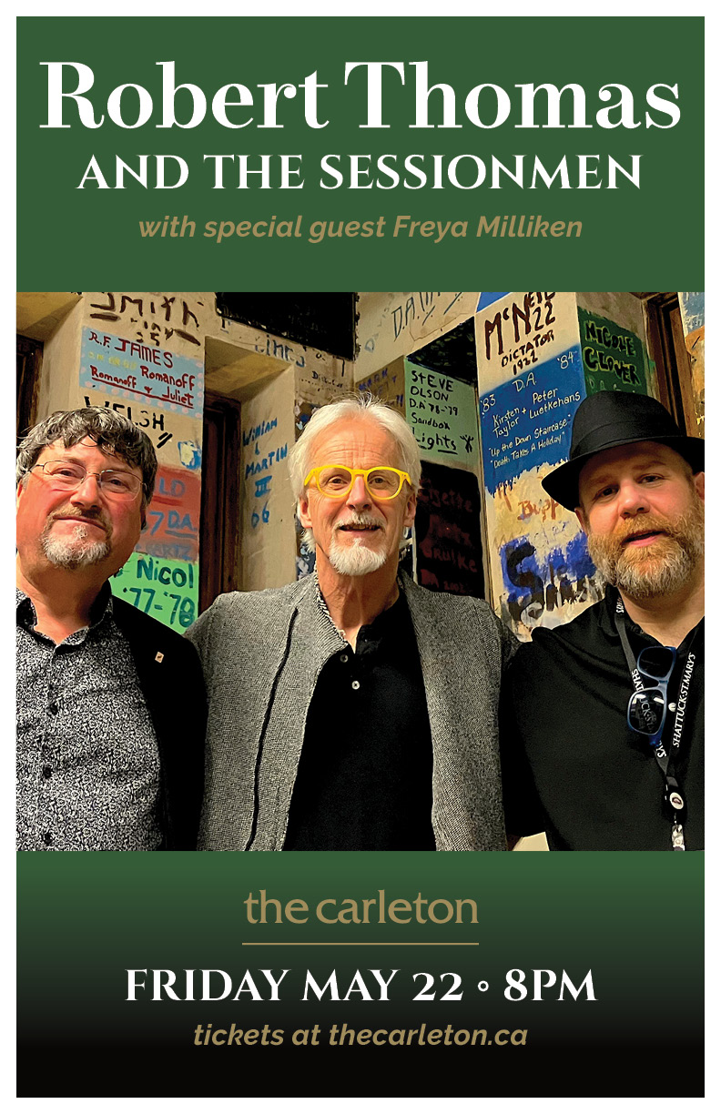 The ever-popular Robert Thomas & the sessionmen bring their stellar songwriting and musicianship – along with special guest Freya Milliken – back to The Carleton on Friday, May 22nd. Show time is 8 PM and tickets are $25 + HST.