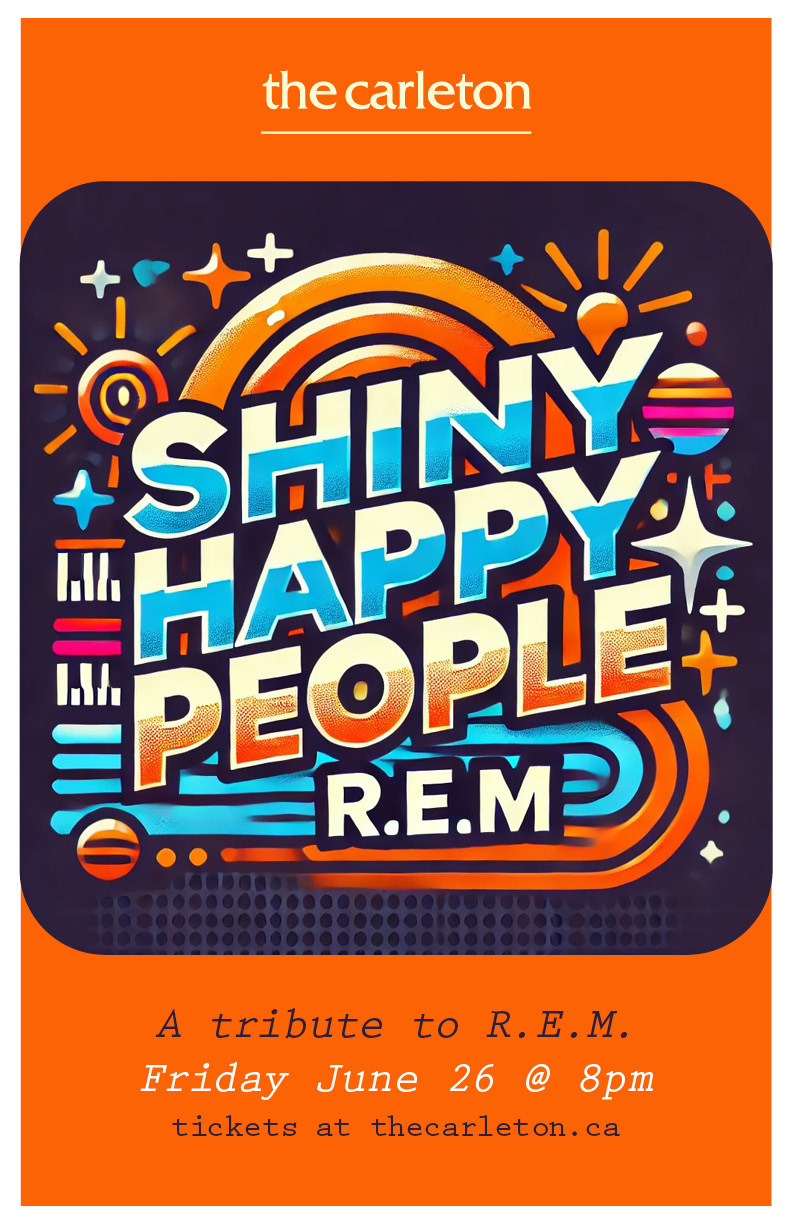 What do Nirvana, Pearl Jam, Radiohead, and Coldplay have in common? All cite the band R.E.M. as a formative influence. Originally from Athens, Georgia, R.E.M.’s debut album Murmur was hailed by Rolling Stone Magazine as the #1 album of 1983 (#2 was Michael Jackson’s Thriller). They would go on to achieve worldwide fame with their iconic albums Out of Time and Automatic for the People. The Carleton is pleased to present Shiny Happy People, an authentic tribute to R.E.M. that will please both diehard fans and those who only know the hits! Intricate guitar parts, ghostly vocals, driving melodic bass lines, weird and wonderful lyrics…you won’t want to miss this and hear about it later!